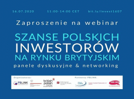 "Szanse polskich inwestorów na rynku brytyjskim" to webinarium organizowane 16 lipca przez Ambasadę Rzeczypospolitej Polskiej w Londynie, Polish Business Link, Zagraniczne Biuro Handlowe Polskiej Agencji Handlu i Inwestycji w Londynie oraz British-Polish Chamber of Commerce. Wydarzenie adresowane jest do polskich przedsiębiorców zainteresowanych inwestowaniem w Wielkiej Brytanii.