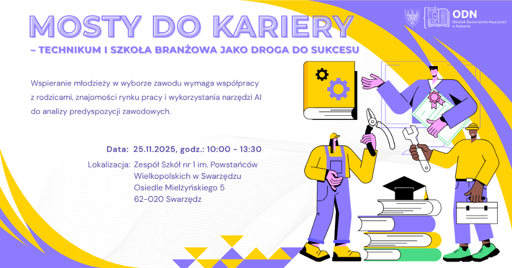 Zespół Szkół nr 1 im. Powstańców Wielkopolskich w Swarzędzu zaprasza pracowników oświaty na bezpłatną konferencję „Mosty do kariery”, poświęconą wspieraniu uczniów w wyborze szkoły i zawodu.