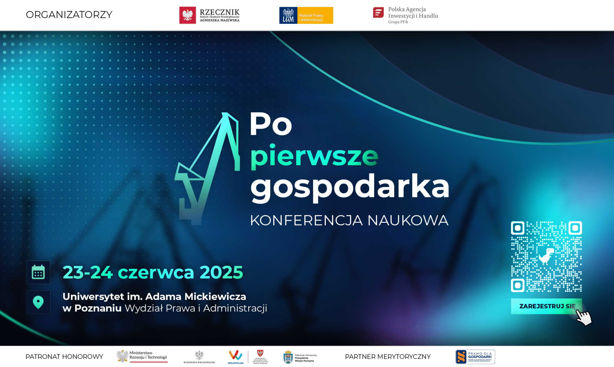 W dniach 23–24 czerwca 2025 r. na Wydziale Prawa i Administracji Uniwersytetu im. Adama Mickiewicza w Poznaniu odbędzie się Ogólnopolska Konferencja Naukowa „Po pierwsze gospodarka…”. Wydarzenie organizowane z okazji Dnia Przedsiębiorcy stanowi platformę wymiany doświadczeń pomiędzy przedstawicielami świata nauki, biznesu oraz instytucji publicznych.