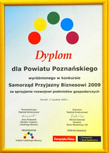 Powiat Poznański został wyróżniony w konkursie "Samorząd Przyjazny Biznesowi." W trakcie Konferencji Lokalnego Biznesu Wielkopolski, zorganizowanej przez Klub Gepardów Biznesu, Tomasz Morawski, Dyrektor Wydziału Promocji, w imieniu Starosty Poznańskiego odebrał statuetkę wraz z dyplomem Powiat Przyjazny Biznesowi 2009, za sprzyjanie rozwojowi podmiotów gospodarczych.