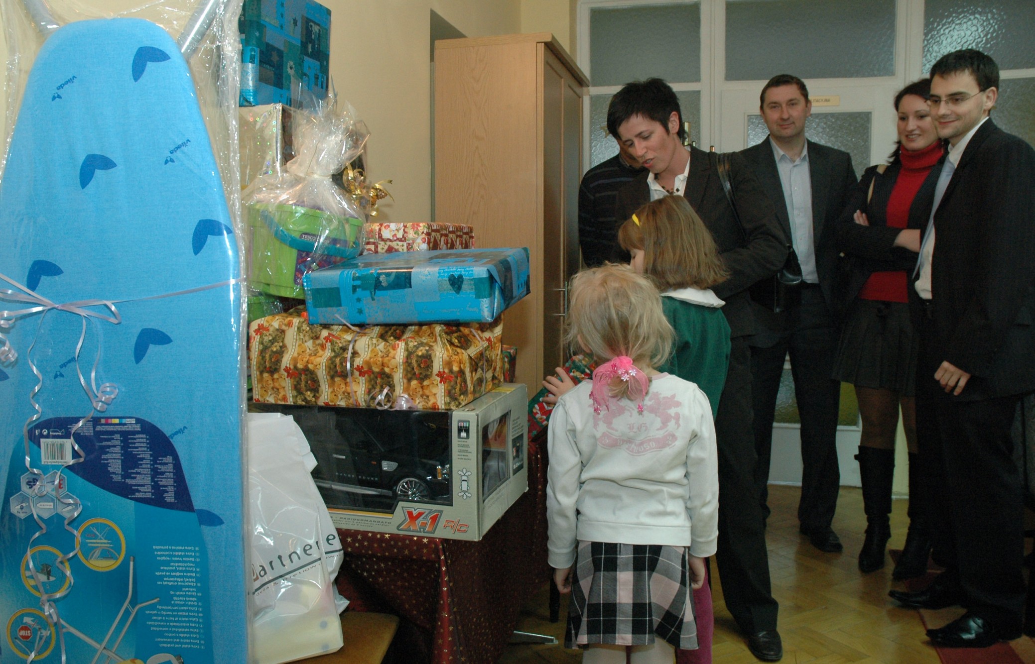 Lucyna Jarczyńska z firmy Agrobex pokazuje dziewczynkom z Domu Dziecka nr 1 ich świąteczne podarunki