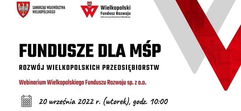Wielkopolski Fundusz Rozwoju zaprasza do udziału w bezpłatnym webinarium nt. funduszy dla MŚP. Spotkanie odbędzie się 20 września 2022 (godz. 10.00-12.00) na platformie YouTube.