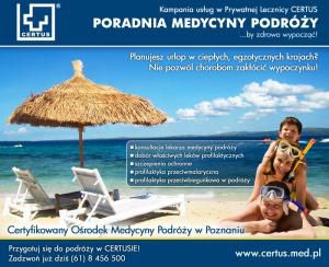 Planujesz urlop w ciepłych, egzotycznych krajach?Nie pozwól chorobom zakłócić wypoczynku!Przygotuj się do podróży razem z nami!Jesteśmy Certyfikowanym Ośrodkiem Medycyny Podróży w Poznaniu!Poradnia Medycyny Podróży działa w Prywatnej Lecznicy Certus od grudnia 2008 roku. Jej siedziba znajduje się w Centrum Medycznym nr 1 przy ul. Dąbrowskiego 262/280 w Poznaniu. Oferta Poradni Medycyny Podróży:konsultacje lekarza medycyny podróży (w tym ocena stanu zdrowia, kompleksowa informacja na temat zagrożeń związanych z podróżami i zabezpieczeniem zdrowia w trakcie podróży), szeroki zakres szczepień ochronnych, dobór odpowiedniej profilaktyki lekowej zależnie od miejsca wyjazdu, profilaktyka przeciwmalaryczna, profilaktyka przeciwbiegunkowa w podróży. Dla drugiej osoby i kolejnych, które razem zgłoszą się do Poradni Medycyny Podróży i wyjeżdżają w to samo miejsce Prywatna Lecznica Certus oferuje rabat w wysokości 50% na konsultację lekarza medycyny podróży.